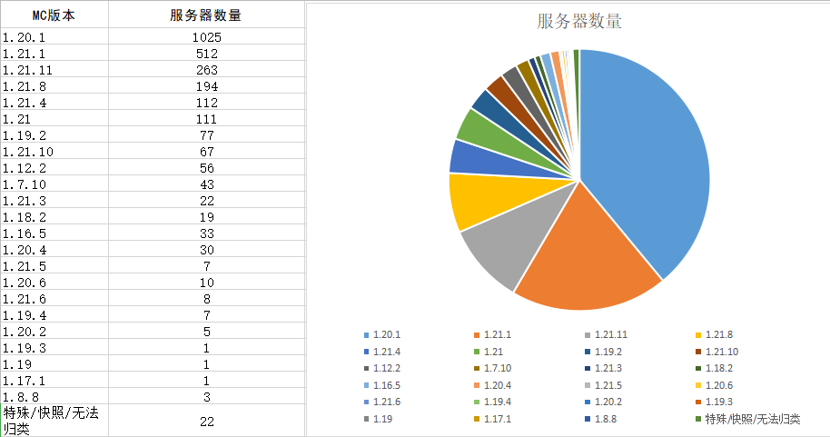 本次检测共收录 2629 个Minecraft Java版服务器。数据显示,服务器版本分布呈现出 “双核主导,生态分化” 的特征。
